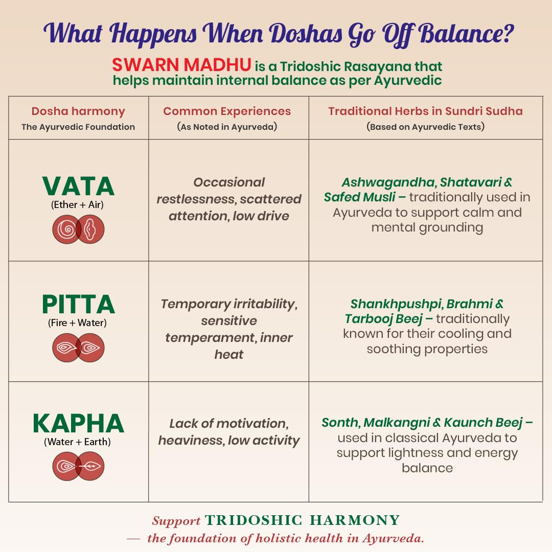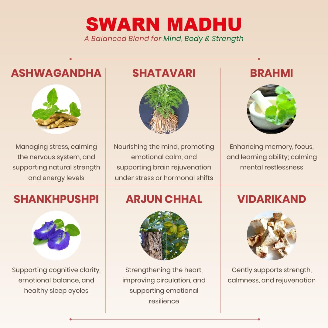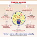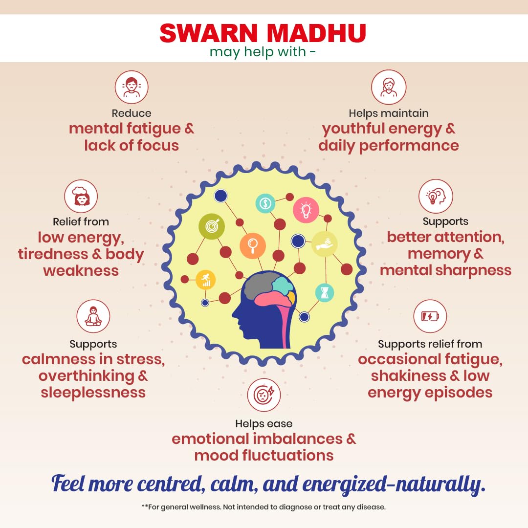 Swarn Madhu produces new energy, vigour, and agility in the body and heart. It cures weakness and dryness of the brain and develops physical and mental powers. It treats mental fatigue, sensation in limbs, palpitation of the heart, sudden blackouts, swoon, insanity, insomnia, chronic headache, backache, shivering of body, and sudden passing of semen. It has aphrodisiac properties.